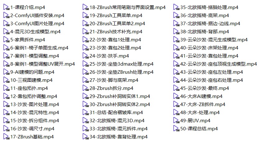 本课程共50节课,核心是教会学员如何利用混元3D高效生成家具模型,在3dmax,zbrush进行模型精修调整,最终达到可商用模型。